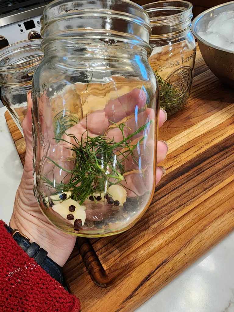 Step 8 – Place a generous amount of fresh dill seed heads and fronds into each jar.