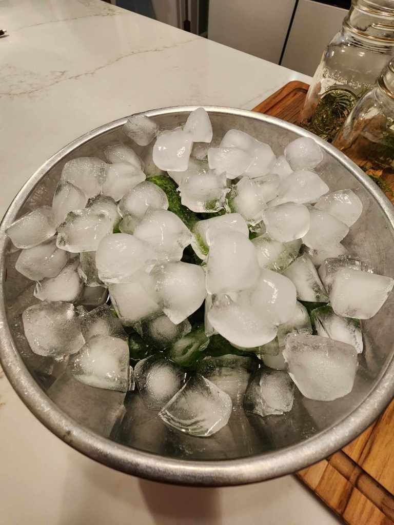 Step 3 – Pop the clean cucumbers into a bowl and top with ice cubes. Let set for 1 to 6 hours. This is the key to the crispest, crunchiest pickles you have ever tasted. If you picked your cucumbers a few days earlier (stored in fridge), this will also help crisp them up again.