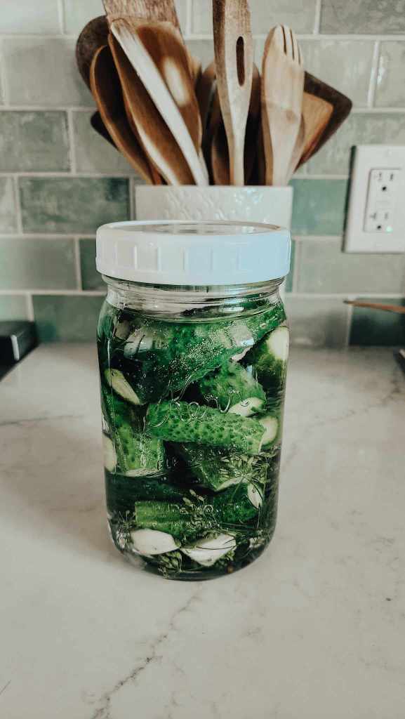 Step 10 – Top with the cooled brine (I pour it into a measuring cup as it has a spout so filling the jars is easy). Screw on the lid, does not have to be a canning lid. Any jar and any lid is fine.