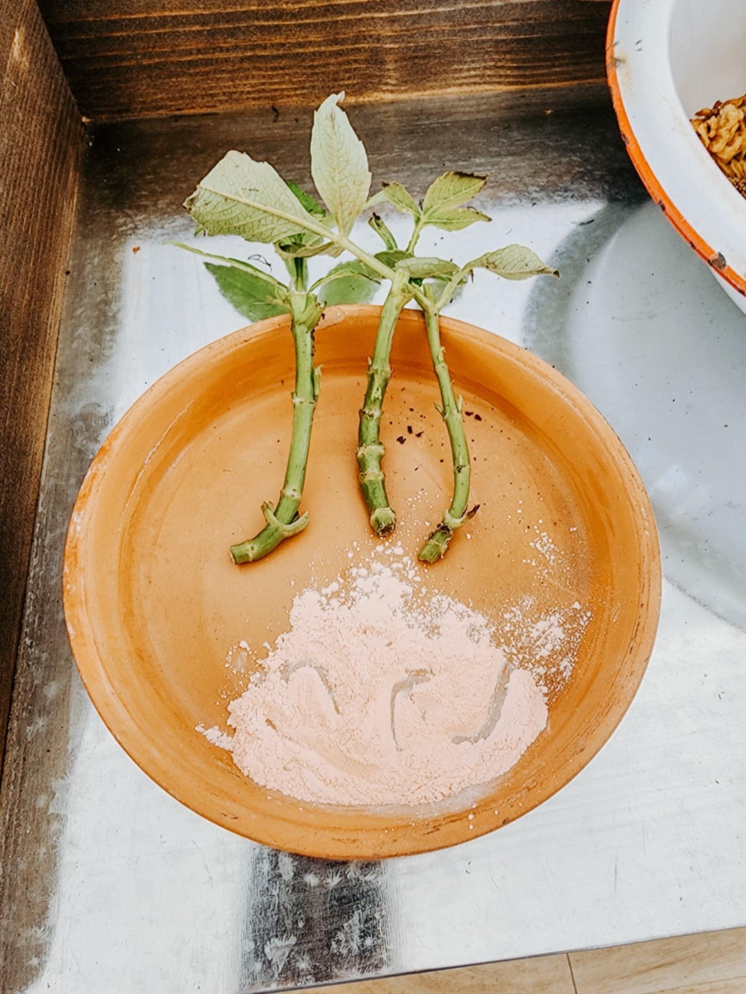Prepare your pots. You can use larger pots that and pot up several stems per pot. I had many of these little round 3″ pots so gave most of the cuttings their own pot. Some of the ones that had the leave nodes farther apart were put into larger, taller clay pots.