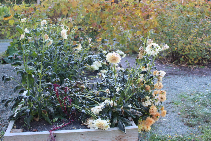 Dahlias keep blooming late into the fall season… until a good frost hits them. They then suddenly look absolutely dreadful, are limp, black, soggy.
