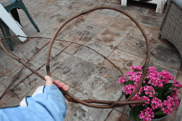 Once you have formed the circle to the size you like, hold onto it at that spot with one hand while you weave the rest of vine in and out of the circle. Once you have woven that first vine all around itself, it should stay together in a circular form nicely without any string to hold it in place. Don’t worry about any long ends sticking out at this stage.