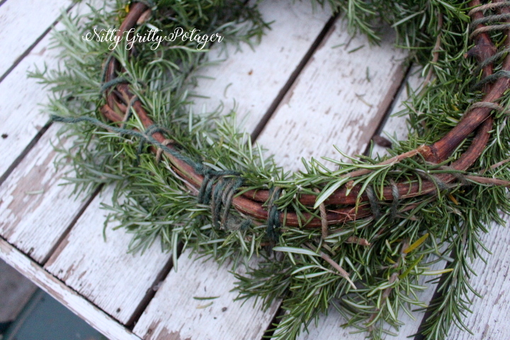 My rosemary needs an annual pruning so this is the perfect craft. I can use all those clippings for something really lovely instead of composting them. It is an upright one growing much too close to the edge of the raised bed. When I planted it, I thought it was the low-growing, creeping kind, had envisioned it growing nicely over the side of the bed. Hah. This thing is now 4 feet tall and would be growing half way into the pathway if I did not keep pruning it back ; )