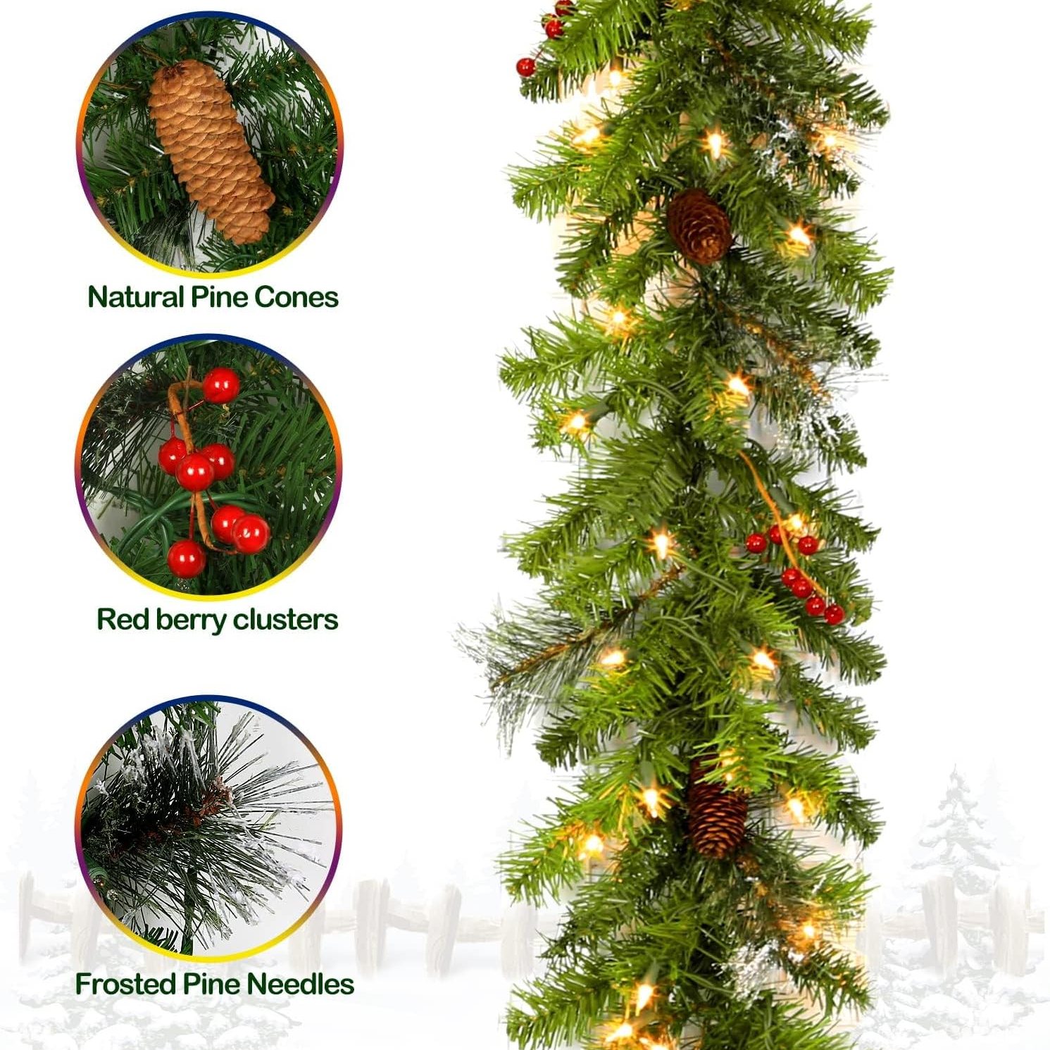 - 9 foot pre-lit garland with pinecones and berries.