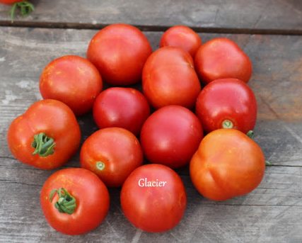 Glacier – 55 days. As its names suggests, this early tomato is great for northern climates! Glacier doesn’t waste time with greenery; plants average out at 2 1/2 to 3 feet in height and bear loads of round red tomatoes! Sweet fruit are 2 to 3 inches in diameter and reddish-orange.