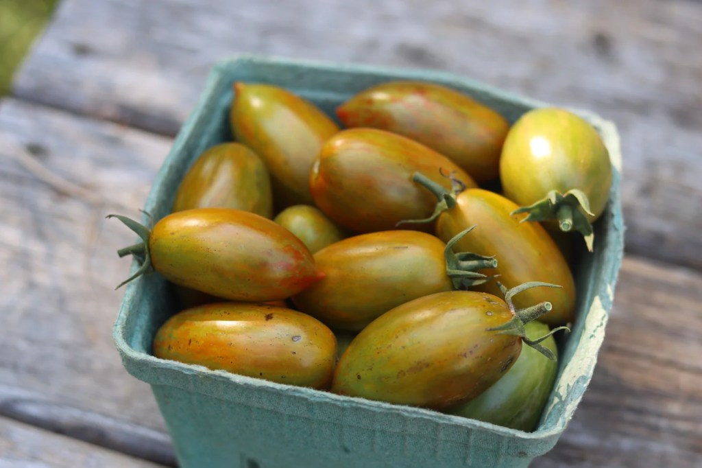 Lucky Tiger Cherry Tomato. Honestly, one of my favourite tomatoes of all time. The elongated 2-inch fruit comes in stunning, jewel-toned shades of green and red, with hints of gold. This tomato gets top marks for flavor: tangy, super sweet, and complex with tropical notes and balanced acidity. Lucky Tiger is well suited for both greenhouse and field growing. 70-75 days to maturity. Indeterminate.