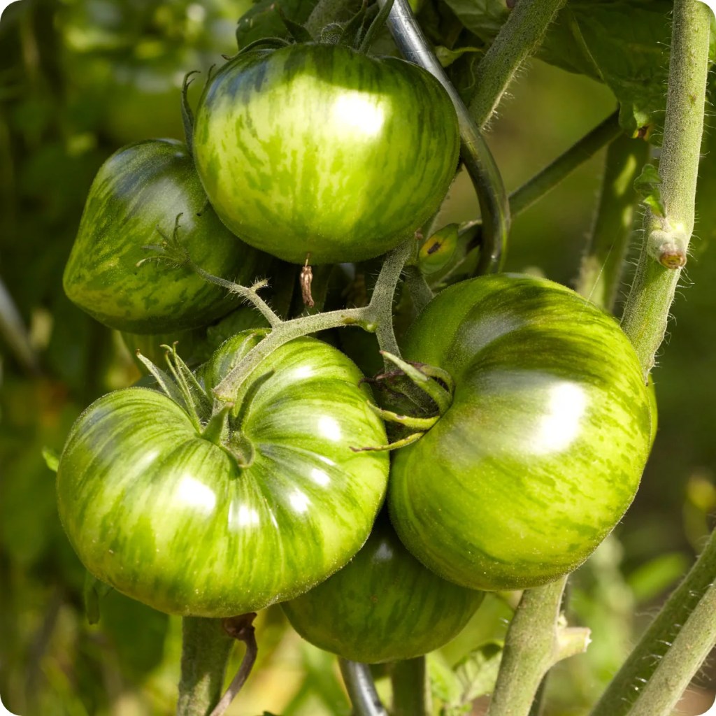 Green Zebra – 72 days. One of the very most popular and delicious green varieties. They are excellent in salads and for slicing and very productive. The tangy green fruit are ripe once the fruit develop a slight yellow backing to its darker green stripes.