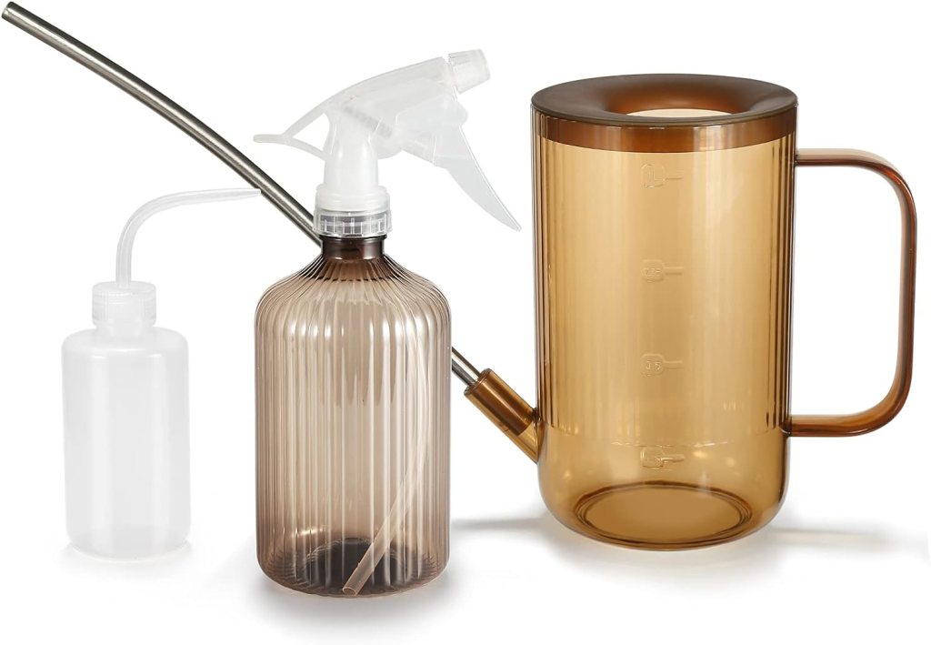 Watering cans. They are on my mind at the moment as I water all the seedlings, and such. The long spouted ones work well for seedlings and indoor watering for less spills, water goes where you want it. That trio. You may be wondering what to do with the squeeze bottle… I tell you, it is perfect for watering seed snails and small pots.