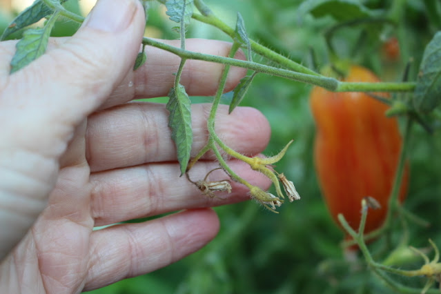Tomatoes in mid to late summer in general – You may find that some of your tomato plants are starting to look like the one above – a bit of brown leaves, drying blossoms, a tired looking plant.