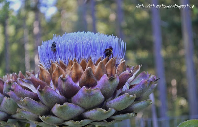 Harvest when the choke petals are tight, as in the picture at the top, or allow it to go to seed for the bees. They adore artichoke flowers. I have had so many bees sharing the one flower!