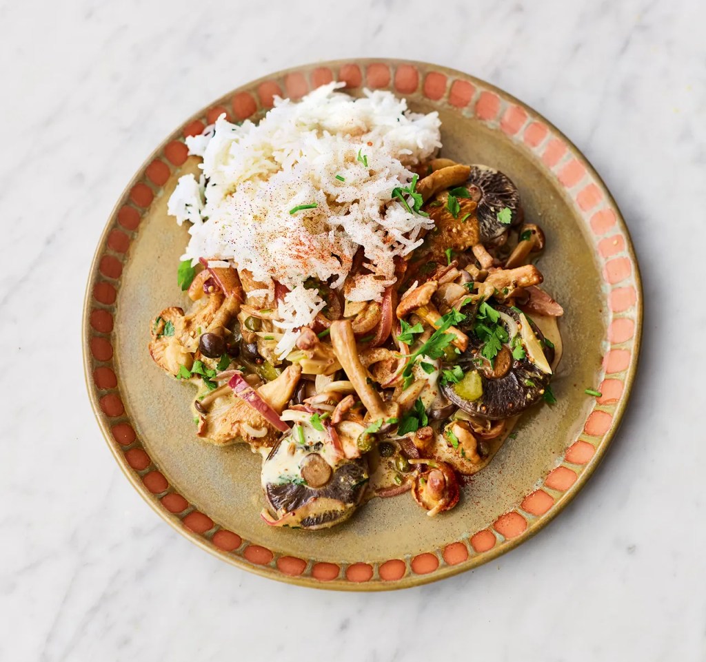 Mushroom stroganoff recipe by Jamie Oliver – the recipe is from this book.